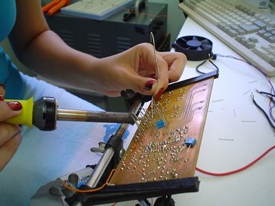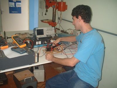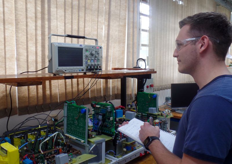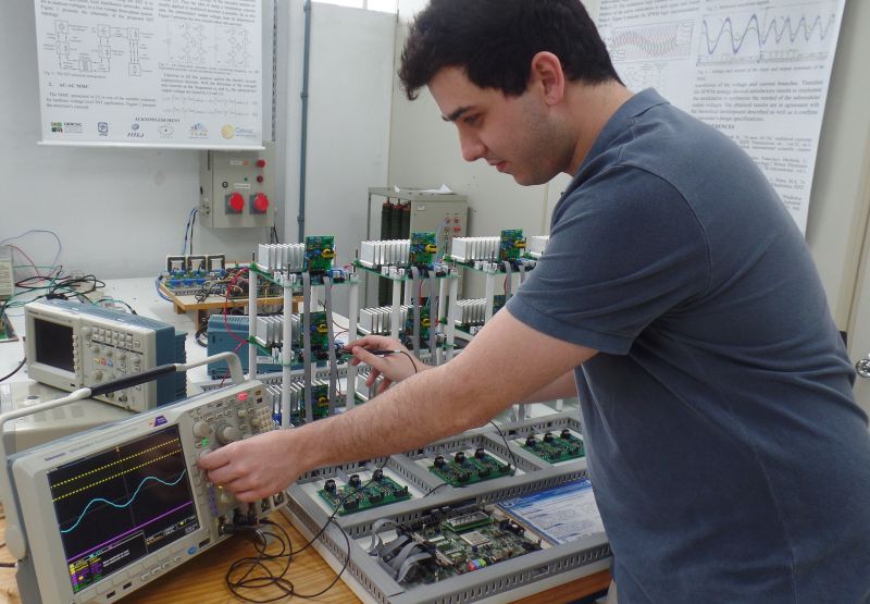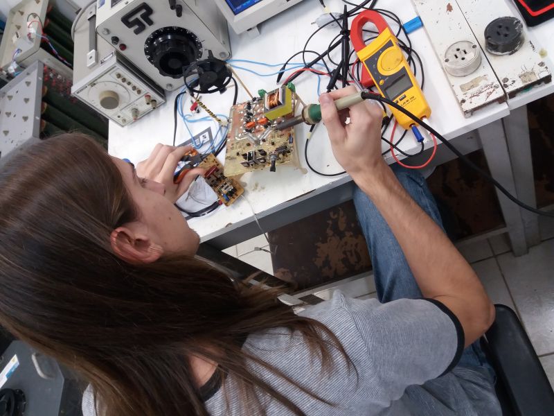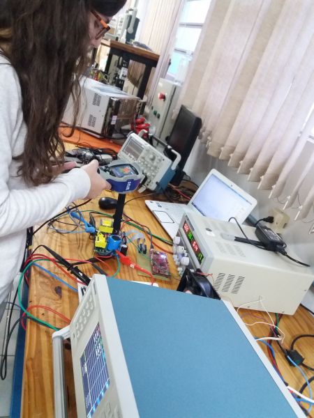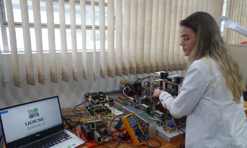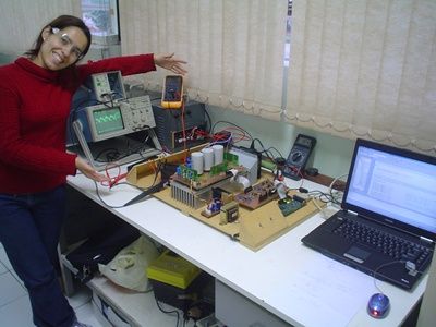 Mestranda Carolina Knaesel realizando testes em conversor para aplicação fotovoltaica.